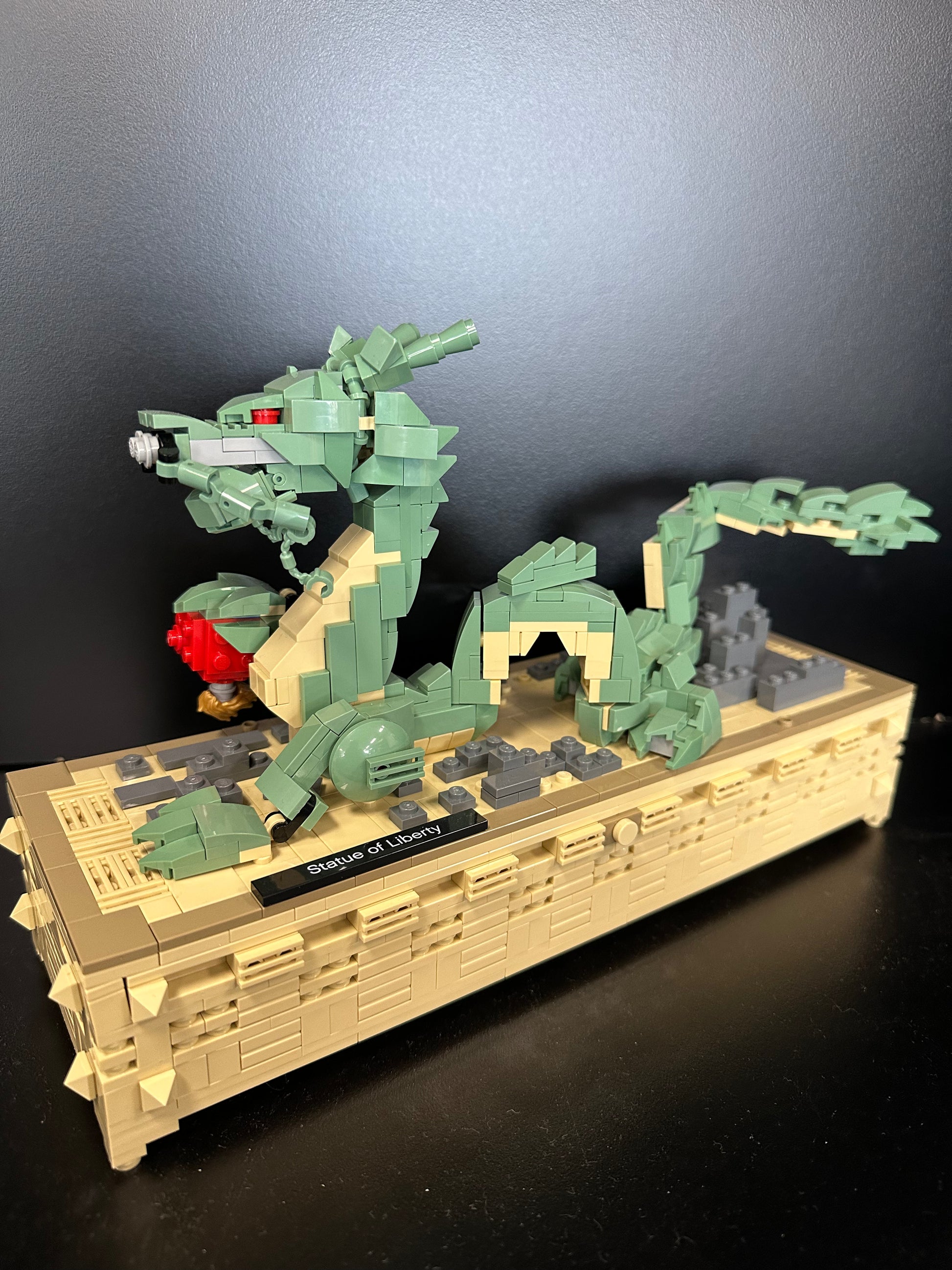 LEGO 21042 Statue of Liberty is a 1,685 piece Architecture set released in 2018. It features a detailed Statue of Liberty and pedestal with intricate design elements and a nameplate.