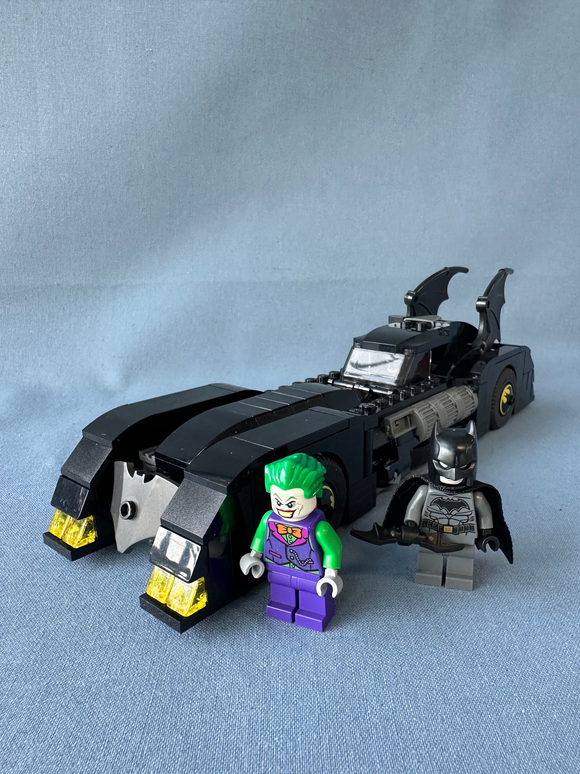 • Detailed Batmobile with bat fins, spinning flame exhaust, and stud shooters