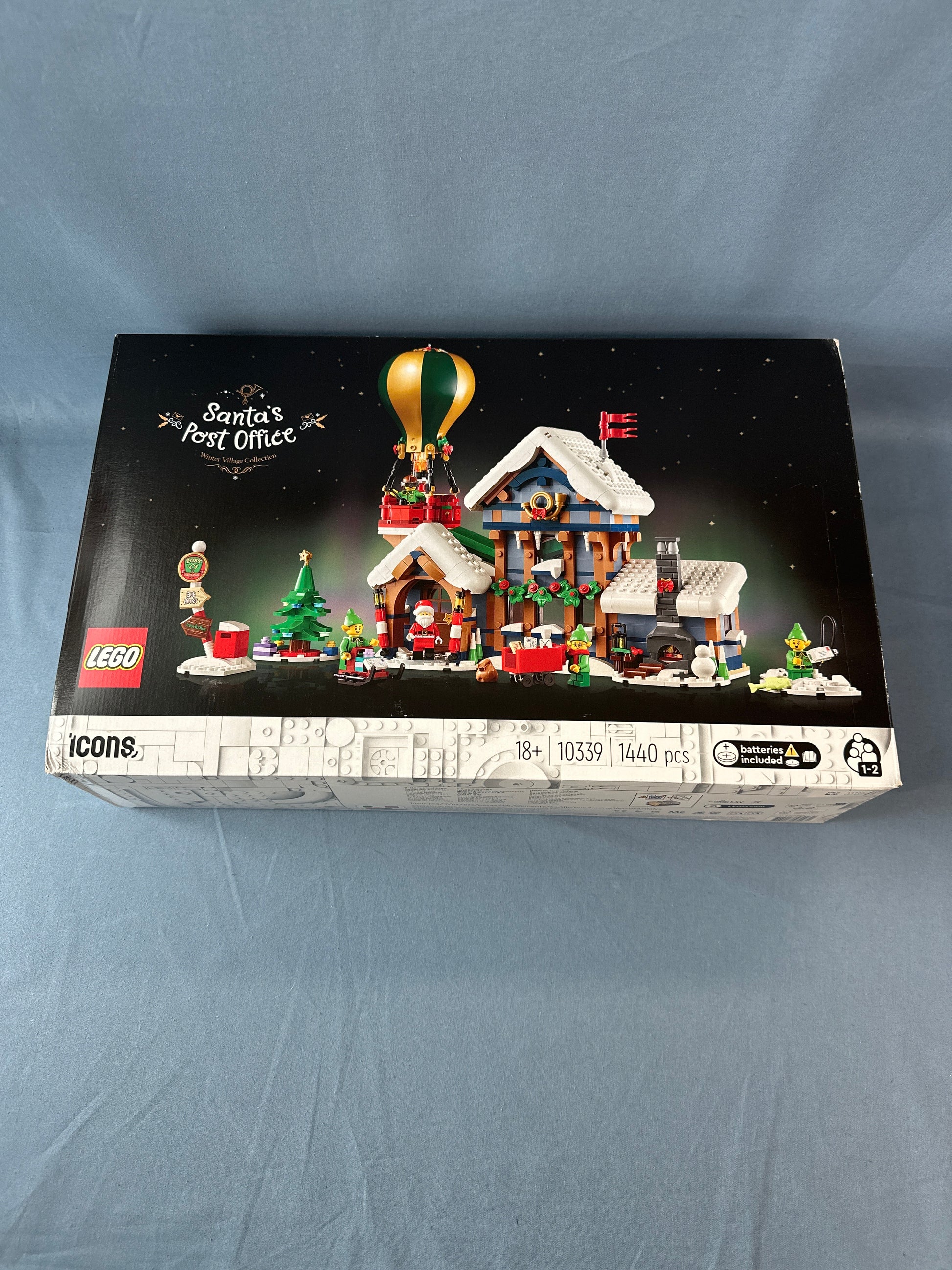The LEGO Icons Santa’s Post Office (10339) is a festive Winter Village set combining storytelling, display, and interactive features. The main build is a snow-topped post office, complete with Santa’s study (with a log fire), an entrance hall with a coffee machine, postal sorting area, a writing area with a letter chute, etc. Side builds include a hot-air balloon with light-brick burner, letter sorter, ice-fishing scene (with a baby seal), a Christmas tree, signpost, mailbox and sled.