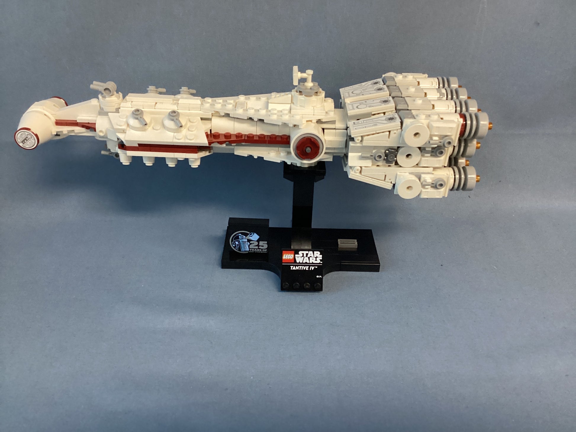 Relive the chase that opened A New Hope with this mid-scale Tantive IV model. Featuring a display stand with a nameplate and exclusive LEGO Star Wars 25th anniversary brick, it captures the iconic blocky lines and rear engine cluster of the Rebel Blockade Runner.