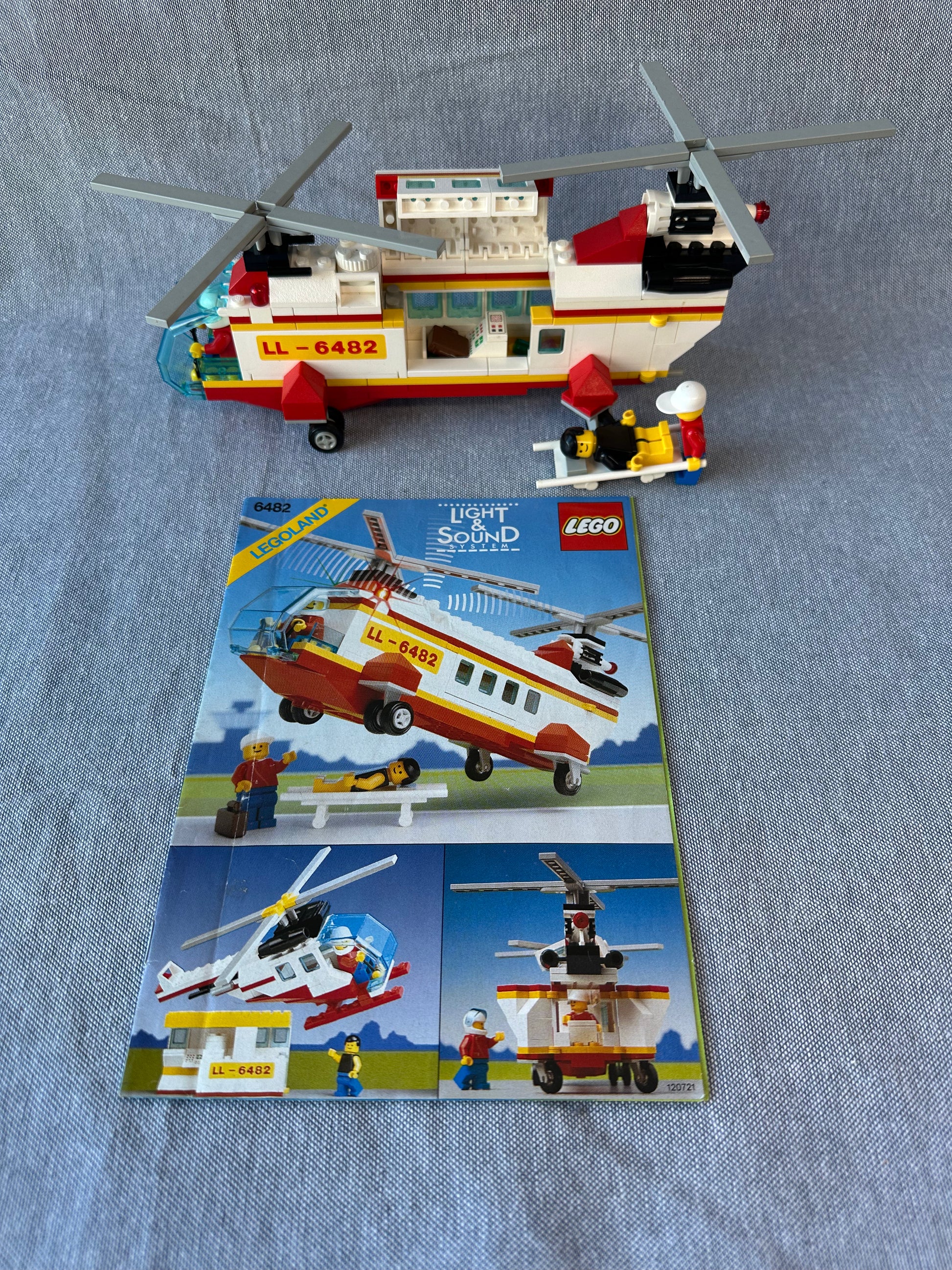The Rescue Helicopter is a classic LEGO Town set from the late 1980s, featuring a twin-rotor helicopter designed for emergency medical missions. It includes a flip-open side panel for interior access, a rear hatch for stretcher loading, and a cockpit with seating for the pilot. Notably, the set incorporates a 9V Light & Sound system with flashing lights and siren effects, enhancing playability. The set comes with three minifigures: a pilot, a doctor, and a patient.