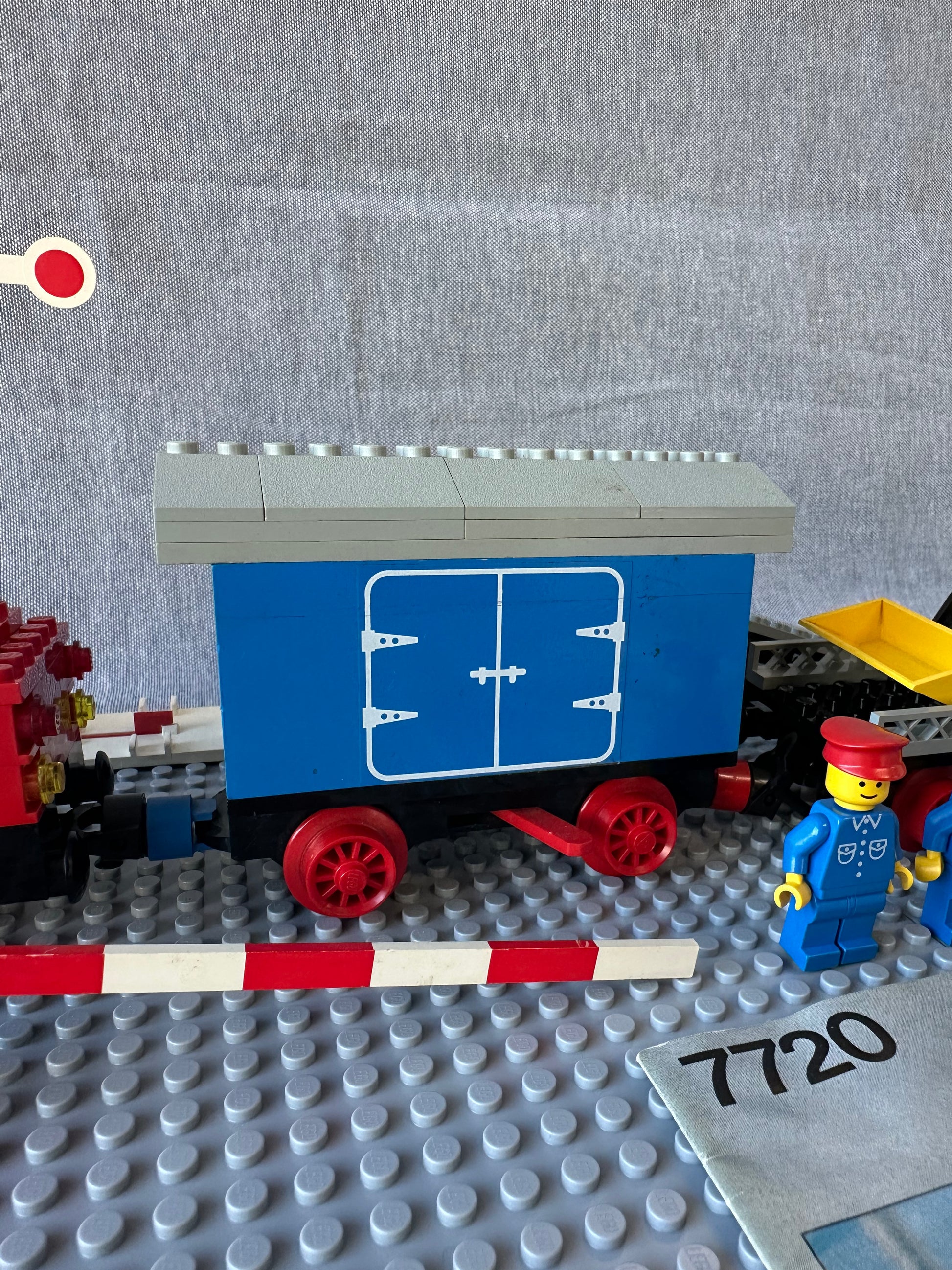 Step back into the golden age of LEGO trains with the 7720 Diesel Freight Train Set. This 4.5V battery-powered set features a striking red diesel locomotive accompanied by three freight wagons, including a flatbed and a cargo car. The set also includes a platform with a ramp and a level crossing with barriers, enhancing the play experience.
