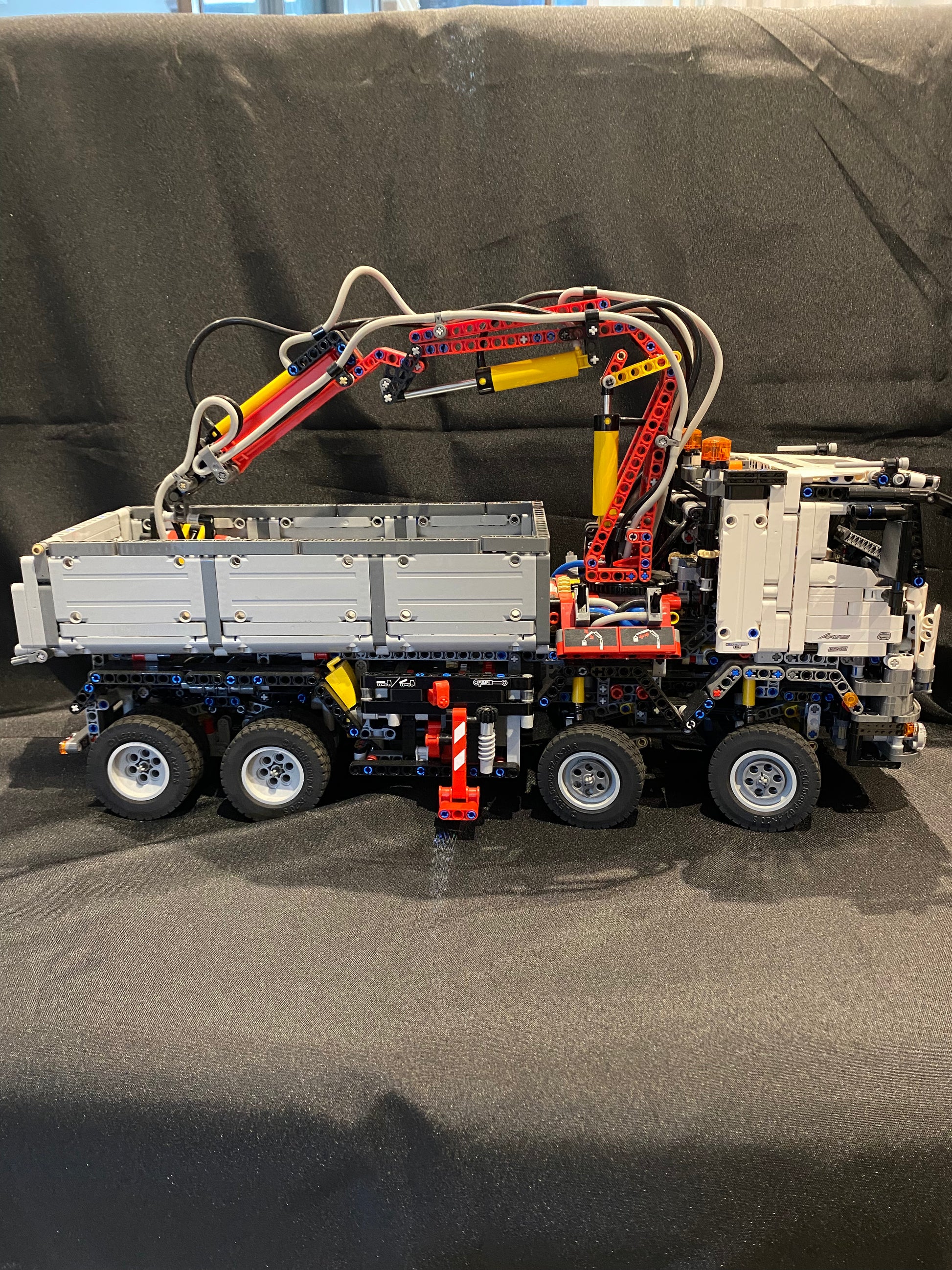 This used LEGO Technic Mercedes-Benz Arocs 3245 has been fully built and comes complete, including the original set box. The model features a working crane with pneumatic controls, extendable outriggers, a functional tipper body, a detailed cab with a six-cylinder engine, twin axle steering, and double differentials for realistic play and display.